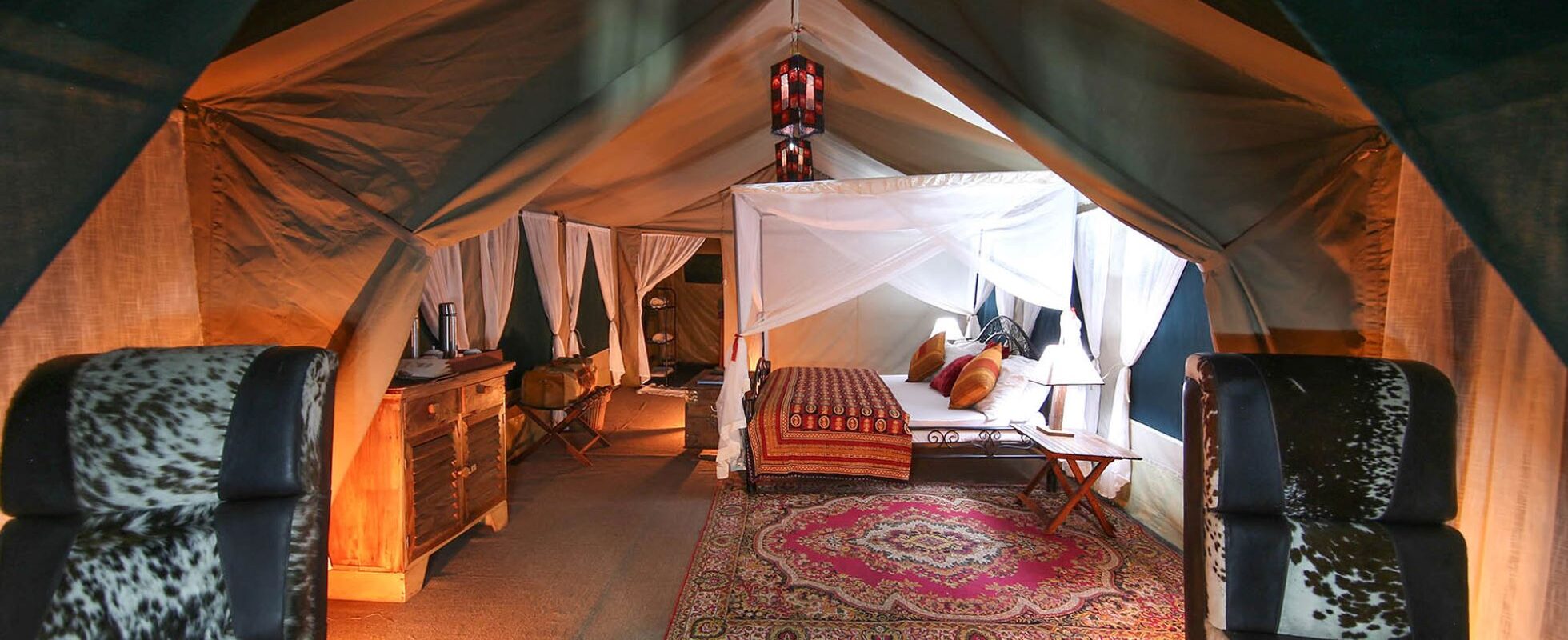 Campen tilbyr elleve mobile safaritelt (inkludert ett familietelt). Teltene er laget av lokalt produsert lerret med myggnetting. Hvert telt har alt du behøver: eget bad, enkelt- eller dobbeltsenger, en kiste til oppbevaring, stoler, bagasjehyller, rent sengetøy og varme tepper i jordtoner for kjøligere netter. Det er også mulighet for å slappe av på en egen, privat terrasse utenfor teltet. Måltidene er laget på dagen med ferske råvarer og serveres i et separat og romslig fellestelt som hviler i skyggen av et imponerende akasietre.